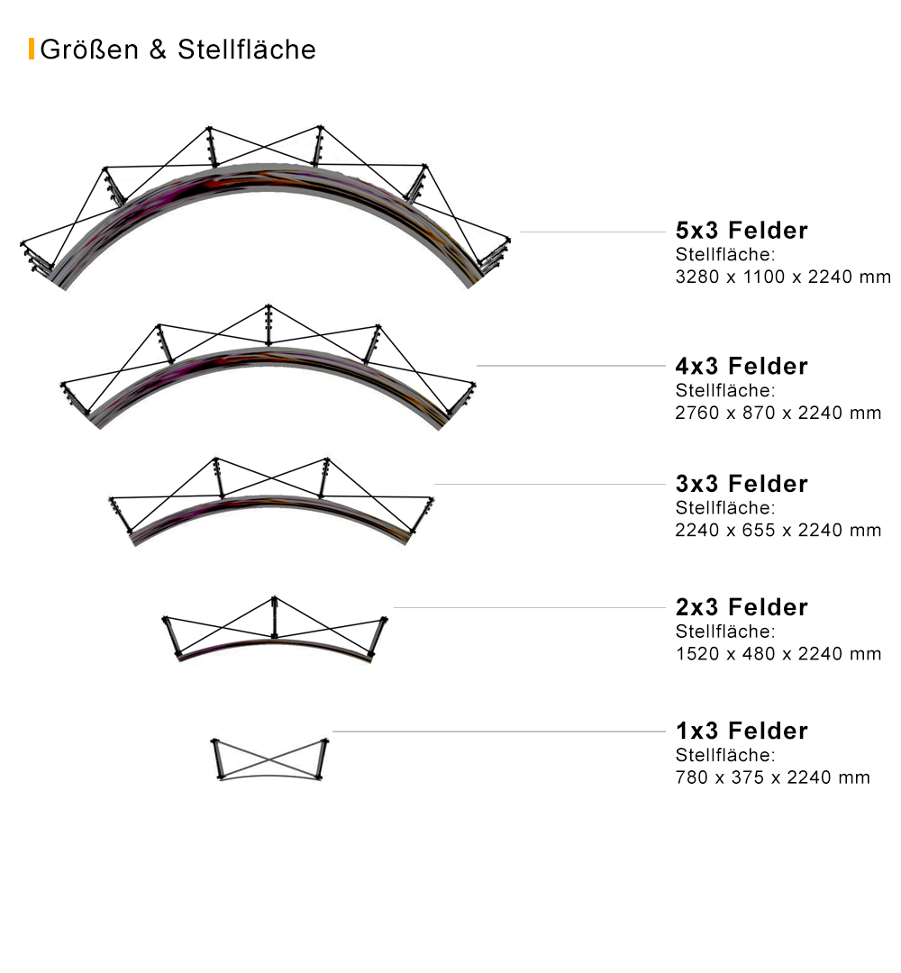 Mit der Messewand gebogen erhalten Sie ein sehr robustes Aluminium Scherengittersystem, das ohne den Einsatz von Werkzeug und von nur einer Person am Veranstaltungsort aufgezogen werden kann. Integrierte Kunststoffhaken stabilisieren durch Verschließen das Grundgerüst und gewährleisten einen sicheren Stand auf Messen & Co.