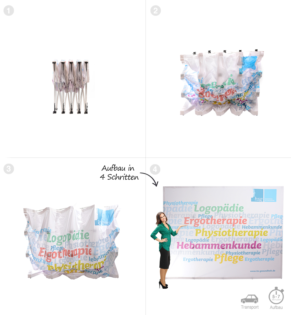 Die gebogene Form der Messewand, sorgt für eine einladende Atmosphäre am Veranstaltungsort und lädt zu interessanten Verkaufs- oder Informationsgesprächen ein. Für den Transport der Messewand gebogen stehen Ihnen unterschiedliche Transportmöglichkeiten zur Verfügung. Stabile Taschen, oder ein robuster Koffertrolley können über unseren Onlineshop ausgewählt werden. Ein bequemer und platzsparender Transport ist Ihnen dadurch sicher, parallel wird Ihr Werbedisplay vor Beschädigungen und Verschmutzungen geschützt.