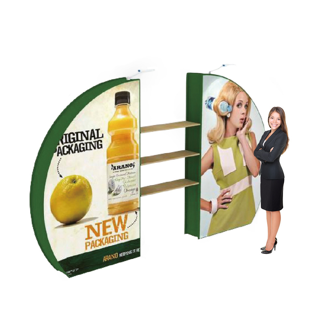 Textil Messewand, runde Form. Ein-/ beidseitiger 4-farb Druck auf Textil. Schnell im Aufbau, leicht im PKW/VAN transportabel.