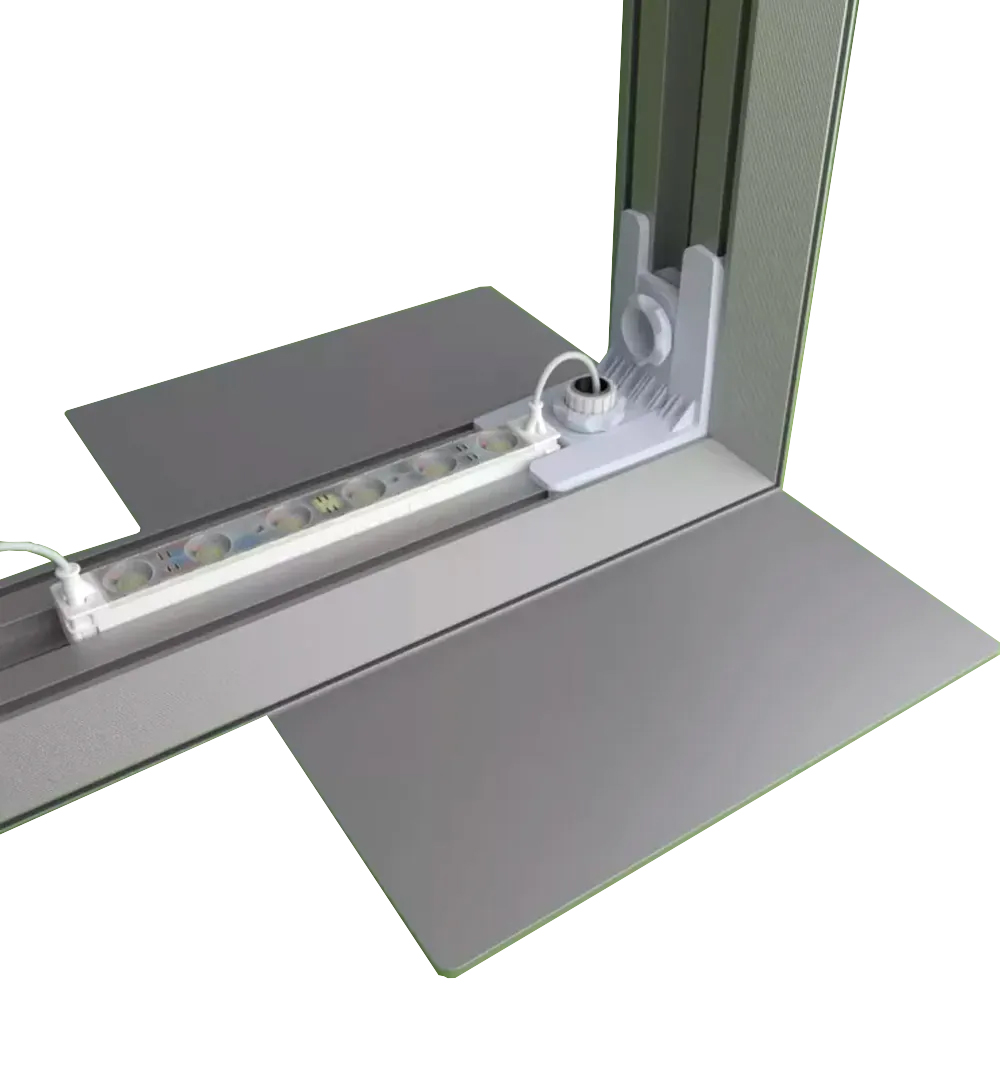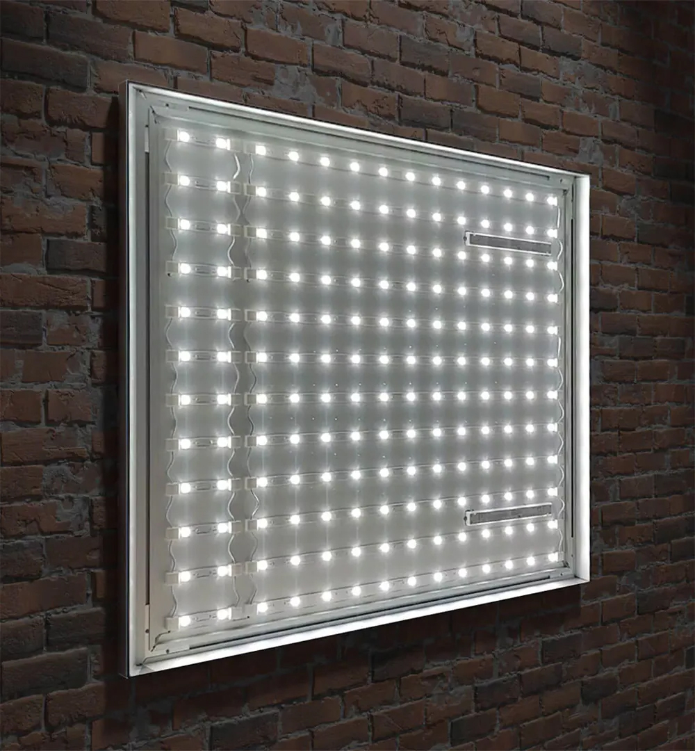 PIXLIP besteht aus leichten Rahmenprofilen, die werkzeuglos zusammengesteckt werden. In den Profilen sitzen integrierte LED-Module, die die Fläche homogen hinterleuchten. Die Grafik ist ein Textildruck mit Silikonkeder (SEG), der randlos in die Nut eingespannt wird.