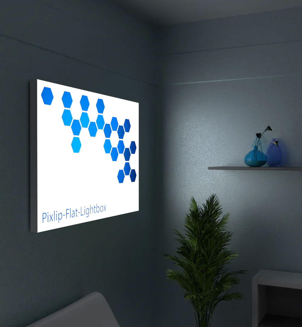 PIXLIP FLAT ist die elegante, ultraflache Lightbox für Wand- oder Deckenmontagen – ideal für Showrooms und hochwertige Retailflächen.