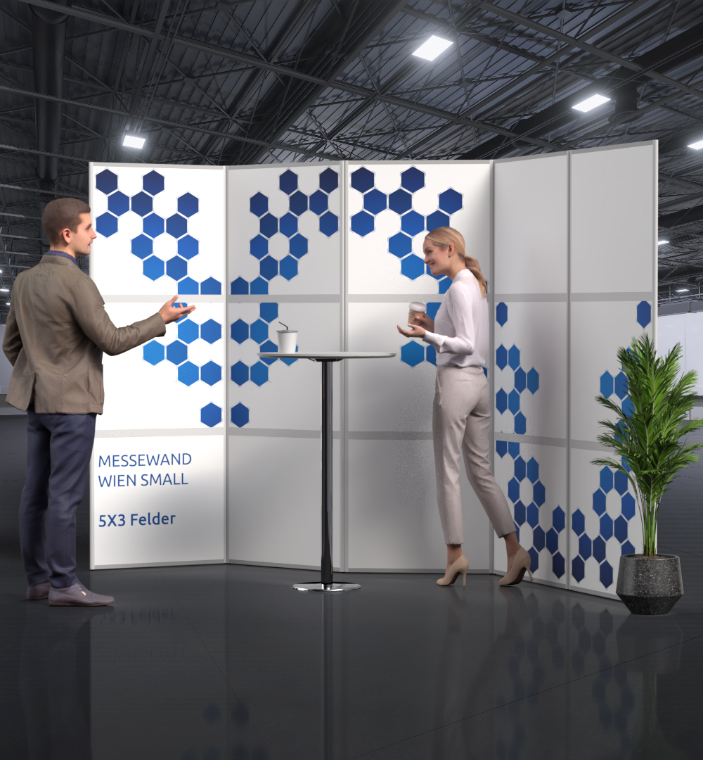 Alle Systeme sind modular und langlebig. Mit individuell bedruckten Grafiken passen wir sie gemeinsam mit Ihnen so an, dass sie perfekt zu Ihrer Marke, Ihren Kampagnen und Ihrer Standfläche passen. Wenn Sie uns besser kennenlernen möchten, finden Sie mehr zu Philosophie, Team und Fertigung auf unserer Seite „Über uns“. Einen ersten Eindruck von geplanten Messeständen und Layouts erhalten Sie über unsere 3D-Visualisierung.