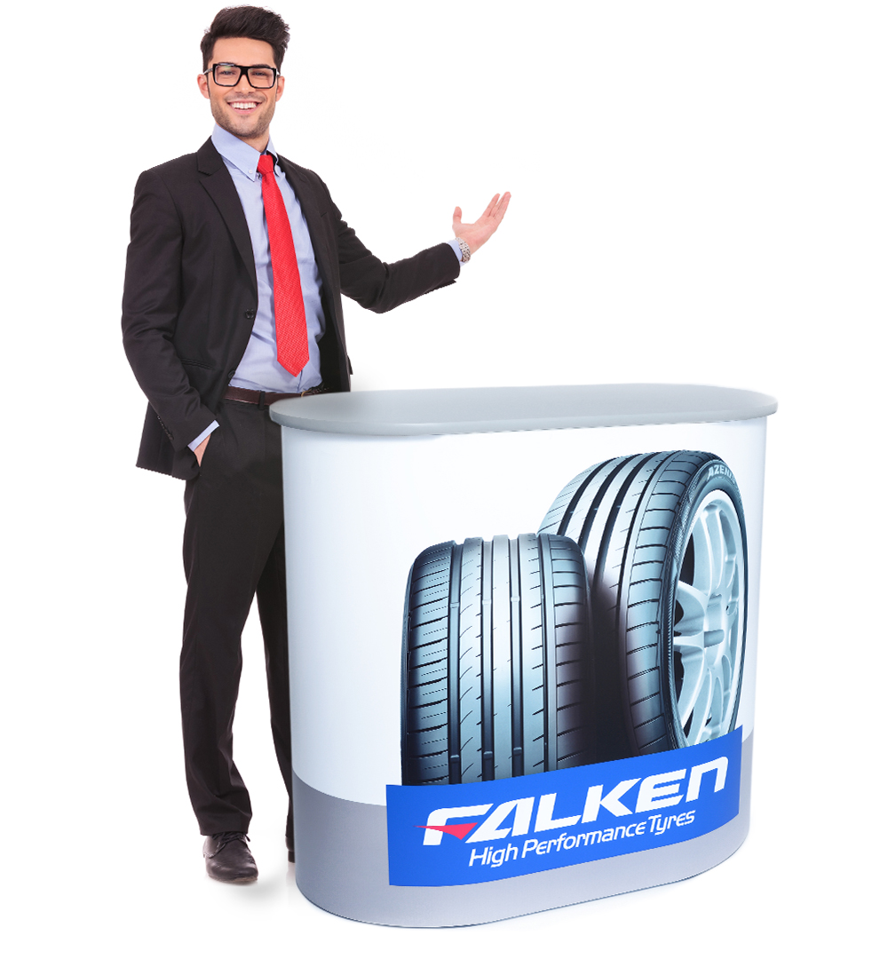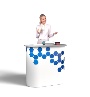 | Druckverfahren | 4-farb Digitaldruck im Sublimationsverfahren (Messewand und Beachflag) / 4-farb Digitaldruck (Theke) |