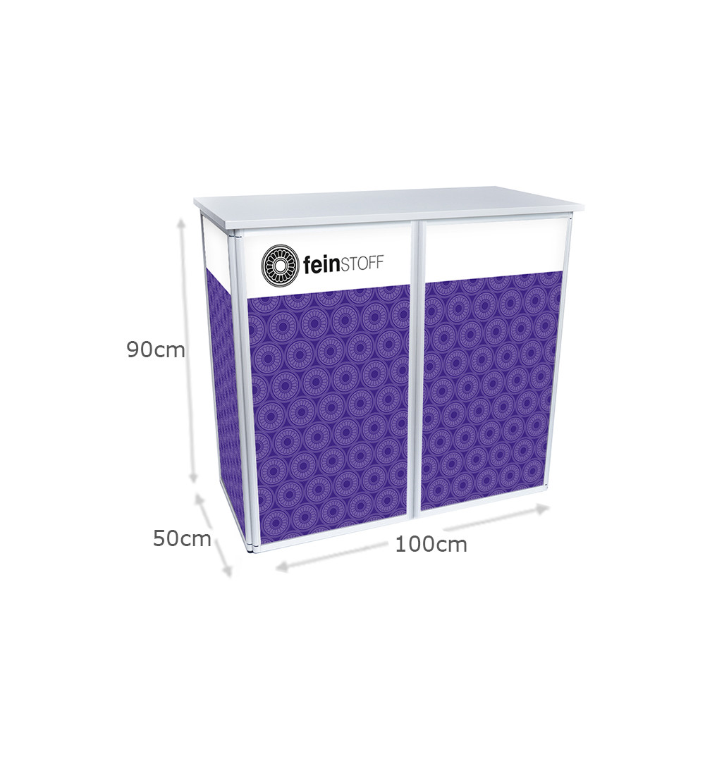 Die stoßfesten 3 mm Hartschaumplatten sind bereits vormontiert, individuell bedruckbar und mit einer kratzfesten Laminierung versehen. Eine belastbare Deckelplatte in Ihrer Wunschfarbe sowie ein optionaler Zwischenboden bieten zusätzliche Ablagefläche. Dank der geteilten Frontfläche lassen sich mehrere Designs oder Markenbotschaften übersichtlich präsentieren – für maximale Aufmerksamkeit bei jedem Messeauftritt.