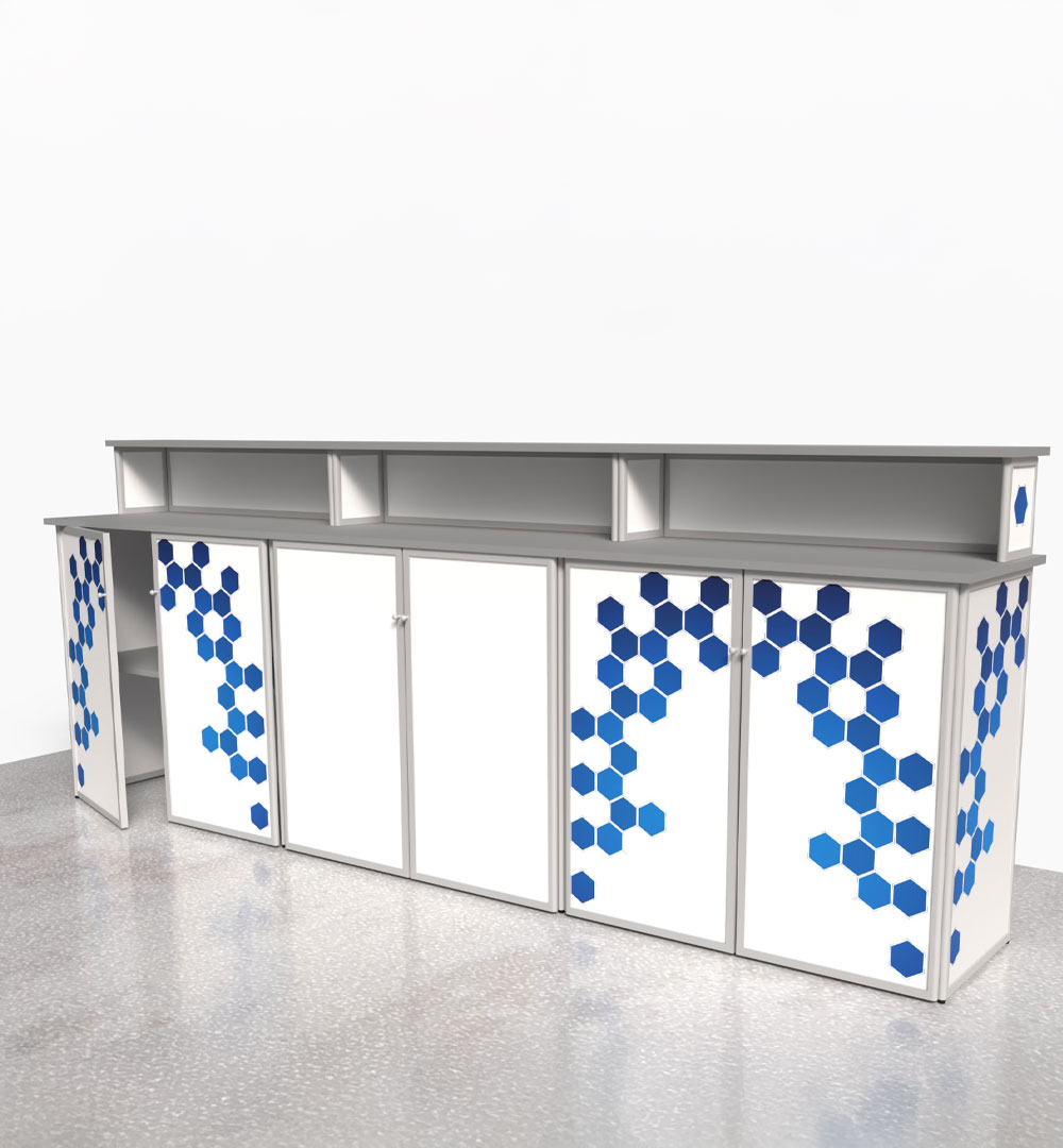Unsere Messetheken sind so konzipiert, dass sie leicht erweitert oder neu gestaltet werden können, um sie an die spezifischen Anforderungen der jeweiligen Veranstaltung anzupassen. Versehen Sie Ihre Messetheke mit individueller Grafik, Logo und Branding-Elementen, um eine dauerhafte und professionelle Markenpräsentation zu gewährleisten.