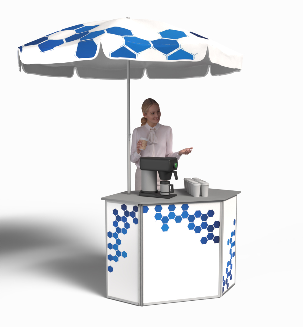Nutzen Sie bedruckte Aufsätze, Topschilder oder Sonnenschirme, um Ihre Messetheke bereits aus der Ferne sichtbar zu machen und Ihre Produkte oder Dienstleistungen noch ansprechender zu präsentieren.