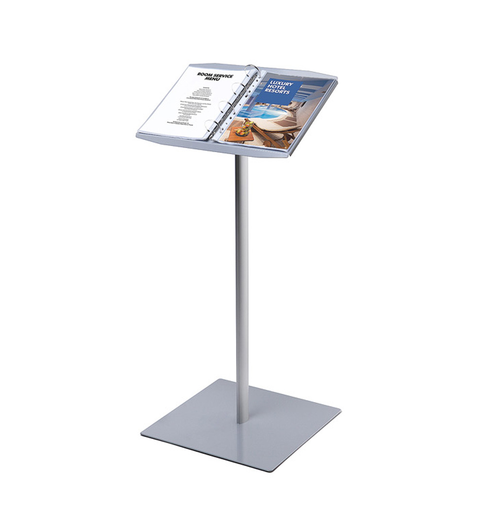 Präsentieren Sie Ihre Speisekarte stilvoll mit dem Speisekartenständer mit Ringbuchhalter! Das schräge Topschild aus Metall ermöglicht eine ansprechende Präsentation mehrerer Seiten, durch die Ihre Gäste bequem blättern können. Der Ringbuchhalter bietet Platz für bis zu 200 A4-Seiten im Hochformat und wird von einem stabilen, eloxierten Aluminiumständer getragen. Für zusätzliche Stabilität sorgt der pulverbeschichtete Stahlsockel mit vier rutschfesten Gummifüßen. Mit diesem Speisekartenständer präsentieren Sie Ihre Inhalte auf eine einfache und ansprechende Weise!