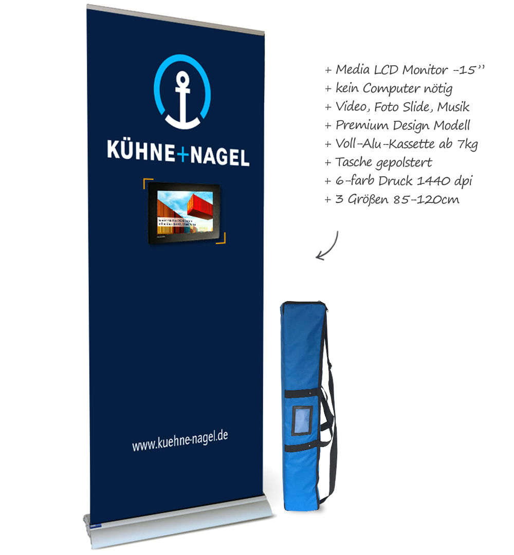 Präsentieren Sie Videos, Fotos und Musik ganz ohne Computer Das Media Roll-Up ist eine Kombination aus einem Roll-Up Quality mit integrierten LCD Bildschirm (Auflösung s. Technische Daten).