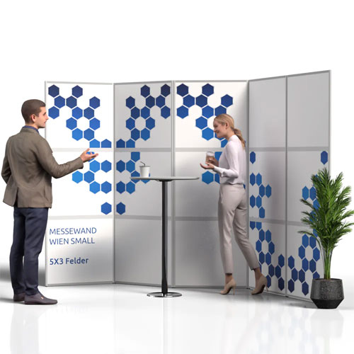 Bei Textilwänden sind Höhen um ca. 230–250 cm üblich. Breiten reichen je nach System von ca. 120 cm bis 900 cm pro Stand und lassen sich modular aneinanderreihen. Ebenfalls verfügbar: vorkonfigurierte Wandstände (z. B. 3 m Kopfstand, 5×4 m Eckstand).