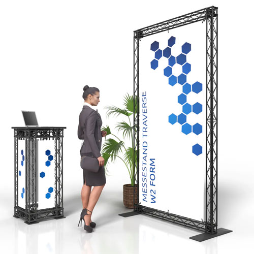 Traversensysteme sind extrem stabil und belastbar – für große Spannweiten, Beleuchtung und Rigging. Grafikflächen via Textil oder Banner; ideal für Bühnen- und Techniklast.