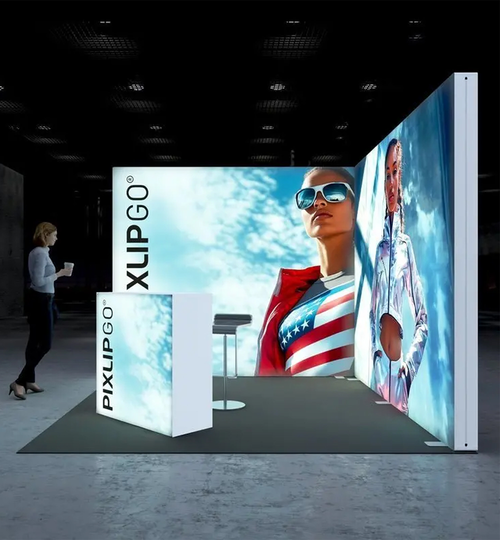 Die PIXLIP GO Lightbox-Elemente mit LED-Hinterleuchtung garantieren maximale Fernwirkung und setzen deine Marke selbst in stark frequentierten Umgebungen optimal in Szene. Der werkzeuglose Aufbau ermöglicht eine schnelle Montage und macht den Stand besonders mobil und anwenderfreundlich.