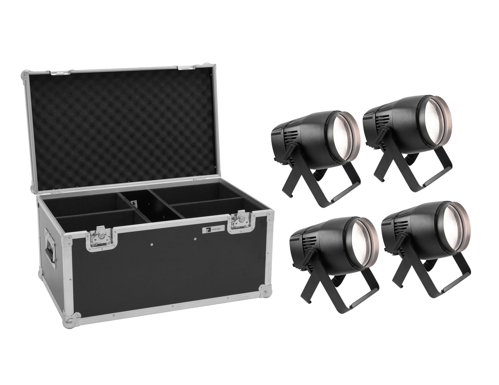 4x wetterfester Scheinwerfer mit warmweißer 100-W-LED inklusive PRO Flightcase