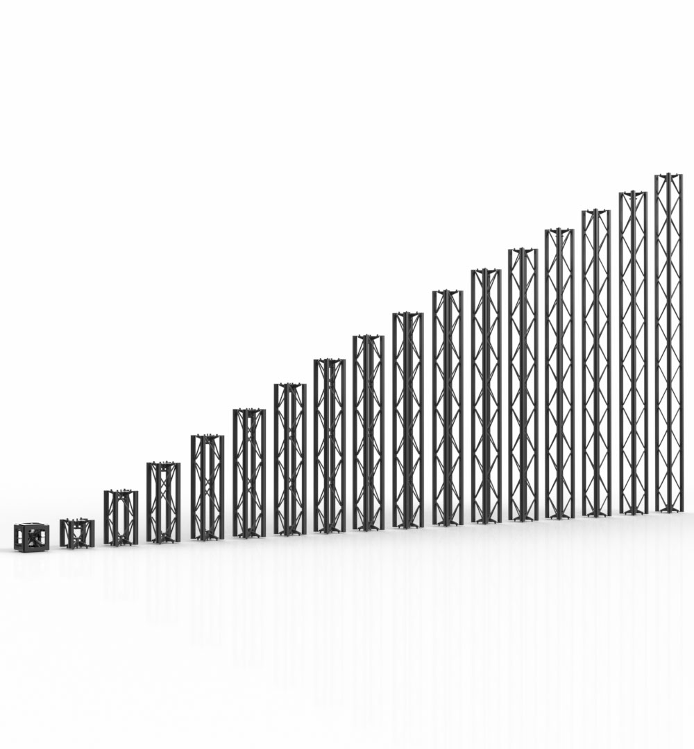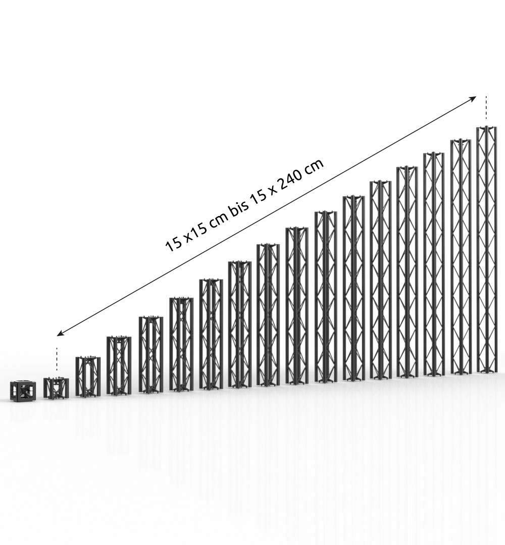 - Zubehör: Traversenverbinder, Eckelemente, Beleuchtung, Transporttaschen