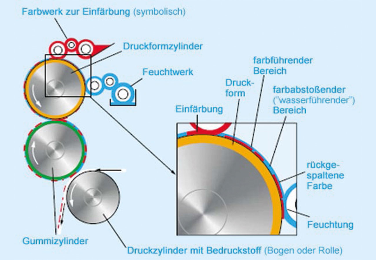 Hierbei spielen drei Zylinder eine zentrale Rolle: der Plattenzylinder, der Gummituchzylinder und der Gegendruckzylinder. Es wird zunächst eine spezielle Druckplatte, meist aus Aluminium, mit dem gewünschten Bild, Text oder Motiv präpariert und auf den Plattenzylinder montiert. Diese Platte wird mit einer dünnen Wasserschicht befeuchtet, gefolgt von der Druckfarbe.